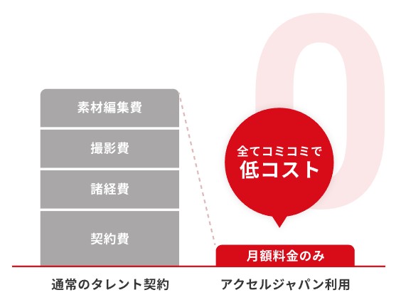 アクセルジャパンは、初期費用ゼロ・月額費用のみで有名タレントの写真・動画素材を使える新しい広告モデルです。Web・紙・SNSなど多様な媒体でのプロモーションに対応。タレント起用に必要なすべてをパッケージで提供し、成長企業の訴求力を高めます。